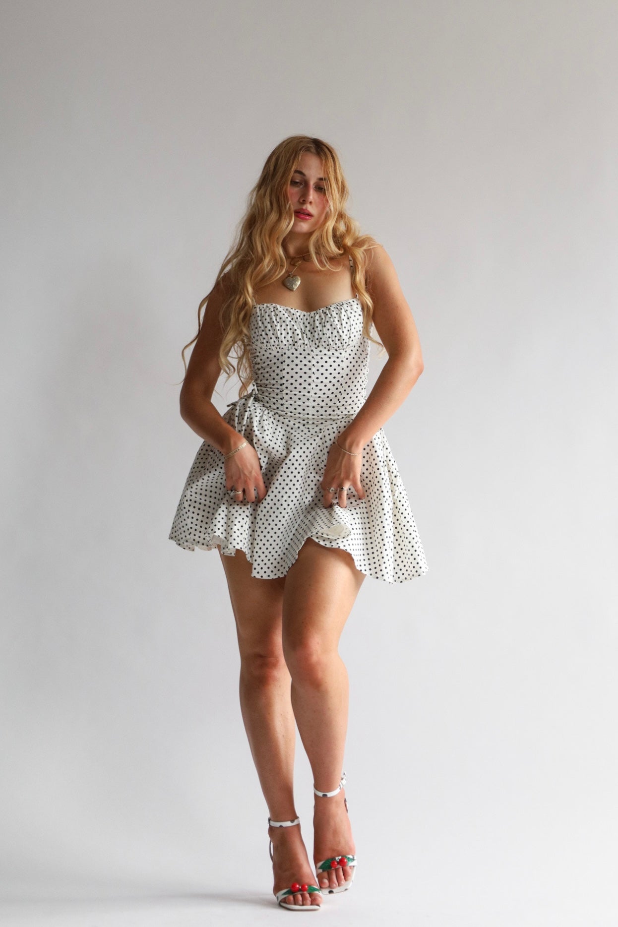 The Felice dress is a cotton stretch polka dot mini-the epitome of summer. It features a black polka dot print on white background with a corset lace up on either side of the bodice so you can cinch to your perfect fit. The Felice also features a low V back and side godets with gathered fabric to create a shapely silhouette.