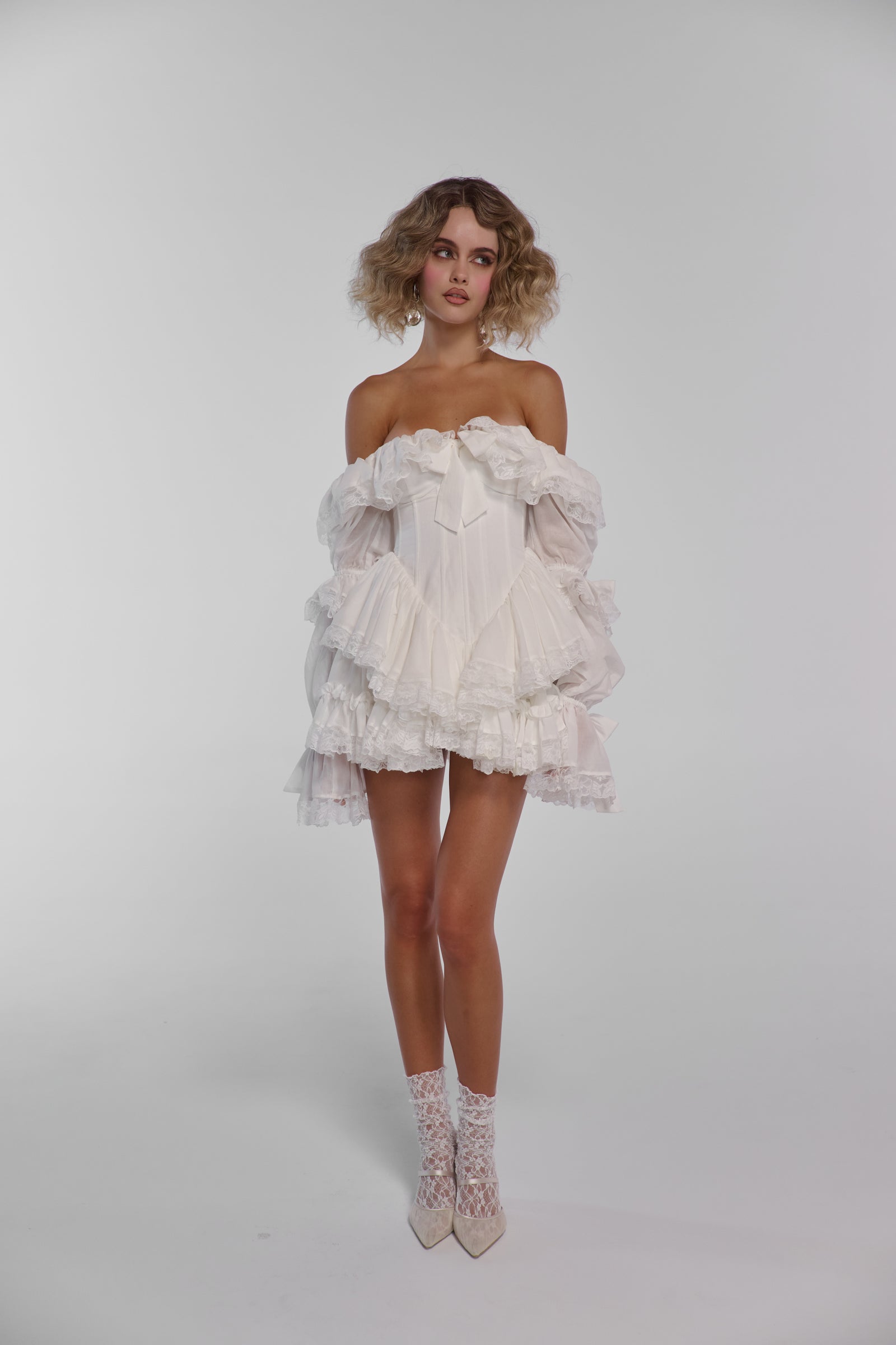 This basque waist corset mini dress brings structure and romance. Underwire cups and boning cinch the waist while a voluminous pleated skirt spins beautifully. Long elastic sleeves can be worn on or off the shoulder. Made for Bal Nègre at midnight, champagne at 2AM, and finding confetti in your hair come morning.
