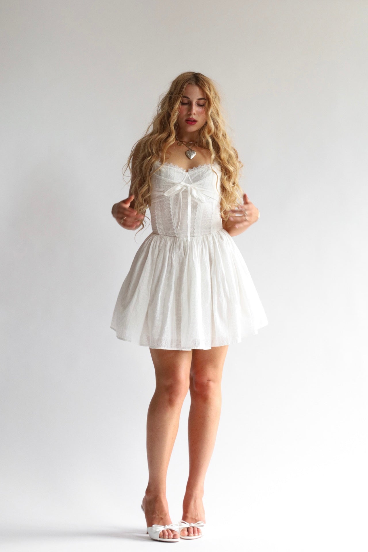 The Malena mini dress is made from a white eyelet cotton featuring an intricate embroidered pattern throughout. The bodice features a wrap portion that can be tied in the center front for added detailing. The underwire cups provide structure and lace trim lined the front and back bodice, stitched in the middle for texture.